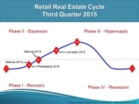 Retail—Retail outperforms all asset classes in total return in two of the last three years, as well as a 20-year time frame. Grocery anchored shopping centers are the preferred asset class. Rent growth was 2.7 percent, up from 2 percent in 2014. Restaurants and entertainment are key: it’s all about the experience. Lancaster is in the expansion phase, but there are a lot of projects in the pipeline. As they come online we could find ourselves in hypersupply.